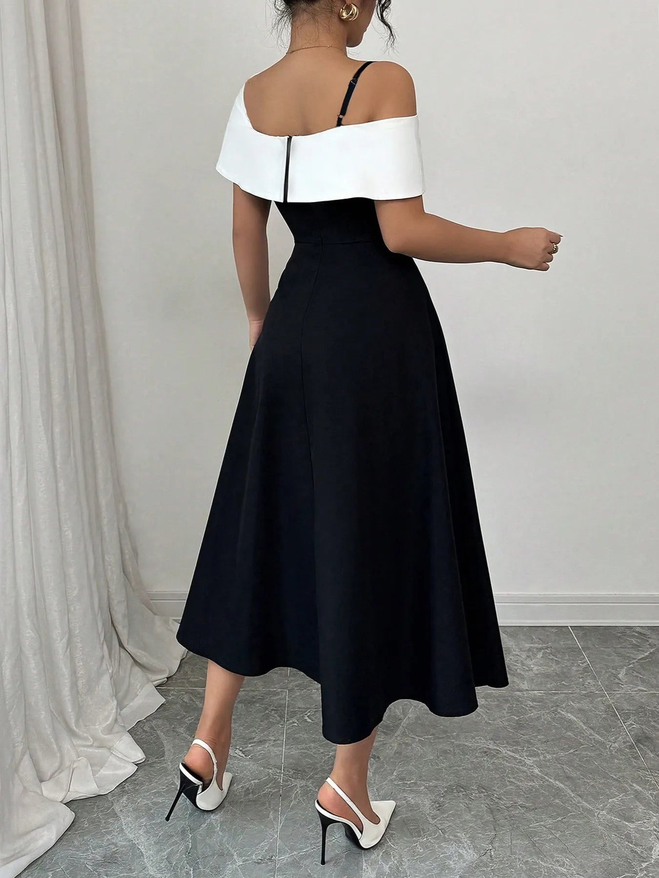 - This Asymmetrical Neck Contrast Midi Dress offers a unique and stylish look, with its asymmetrical neckline and contrasting colors. The dress is made from quality materials and is designed to flatter your figure. Perfect for any occasion, this dress is a must-have for any fashion-forward individual.