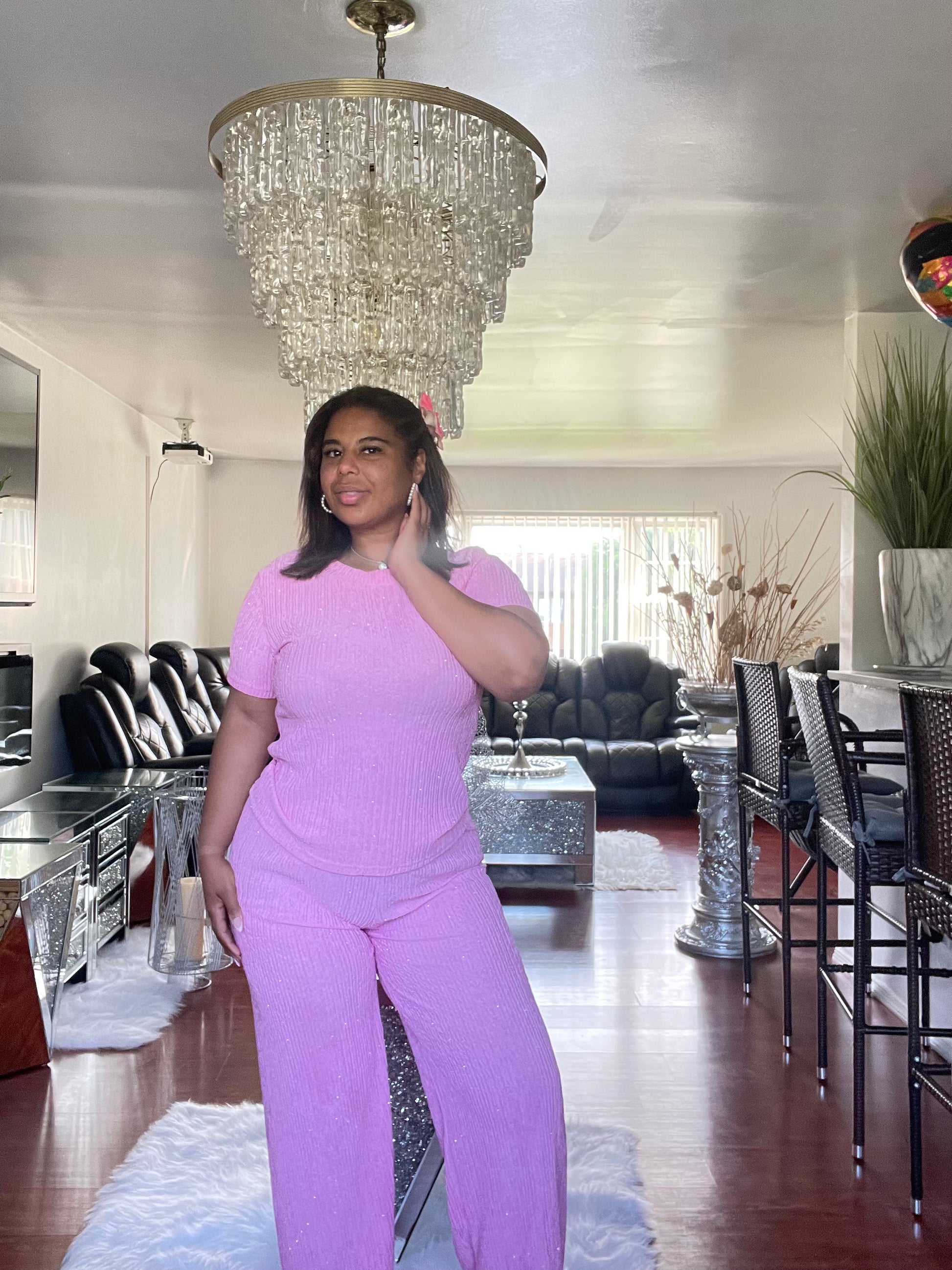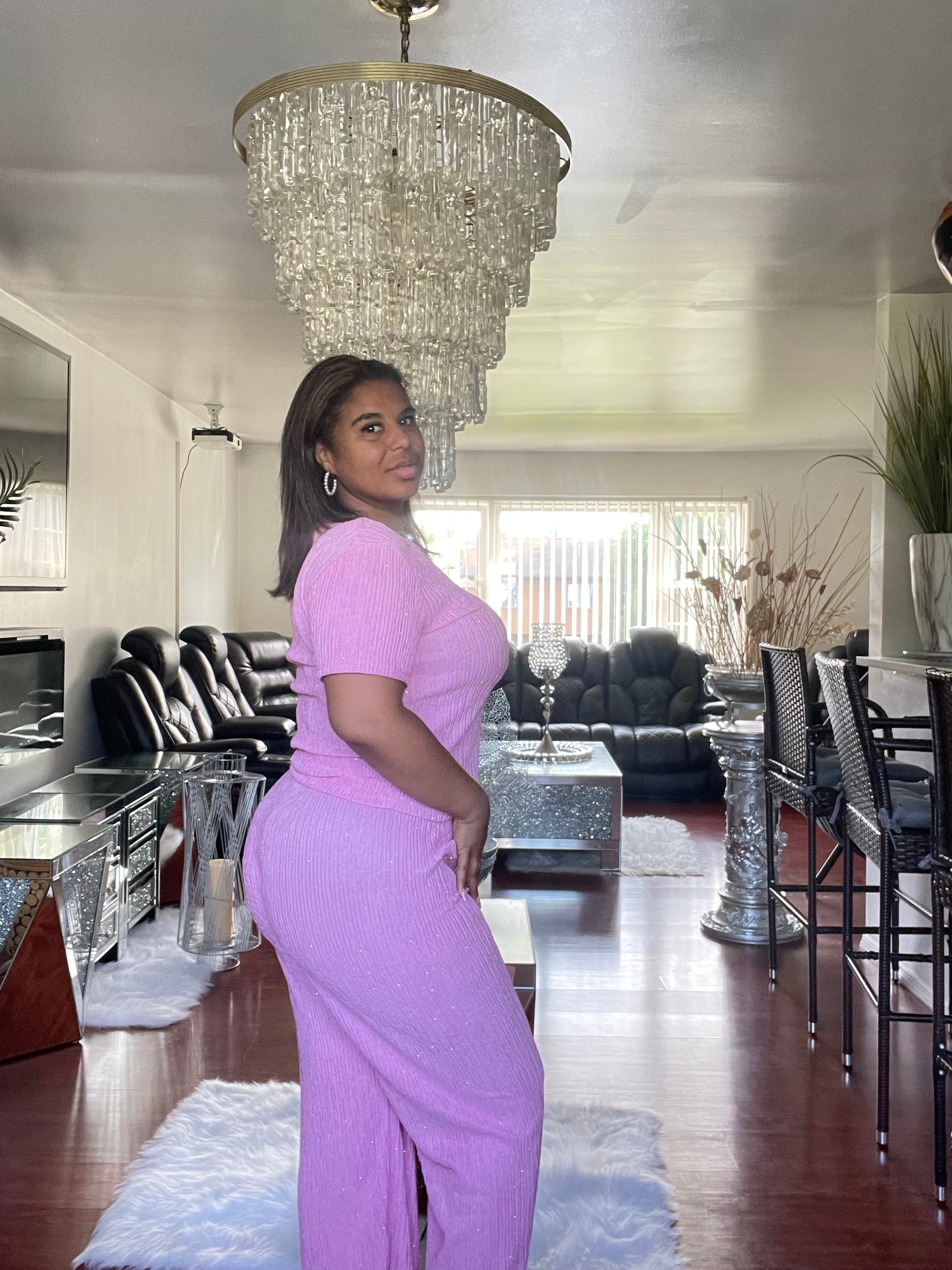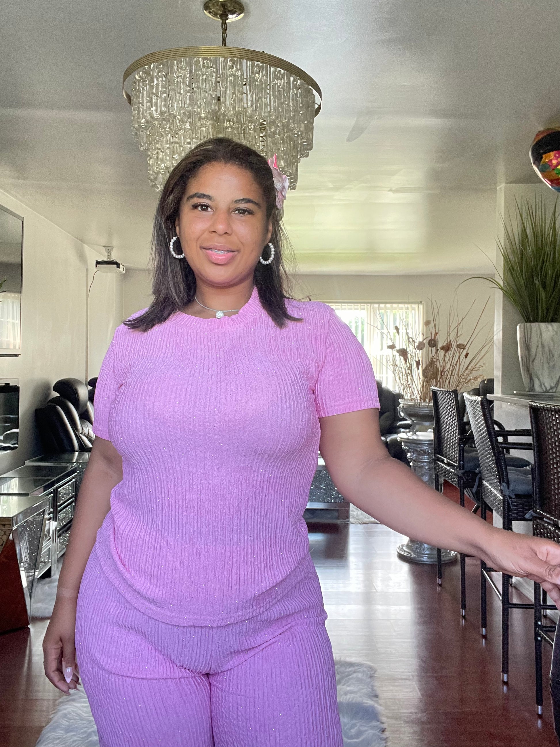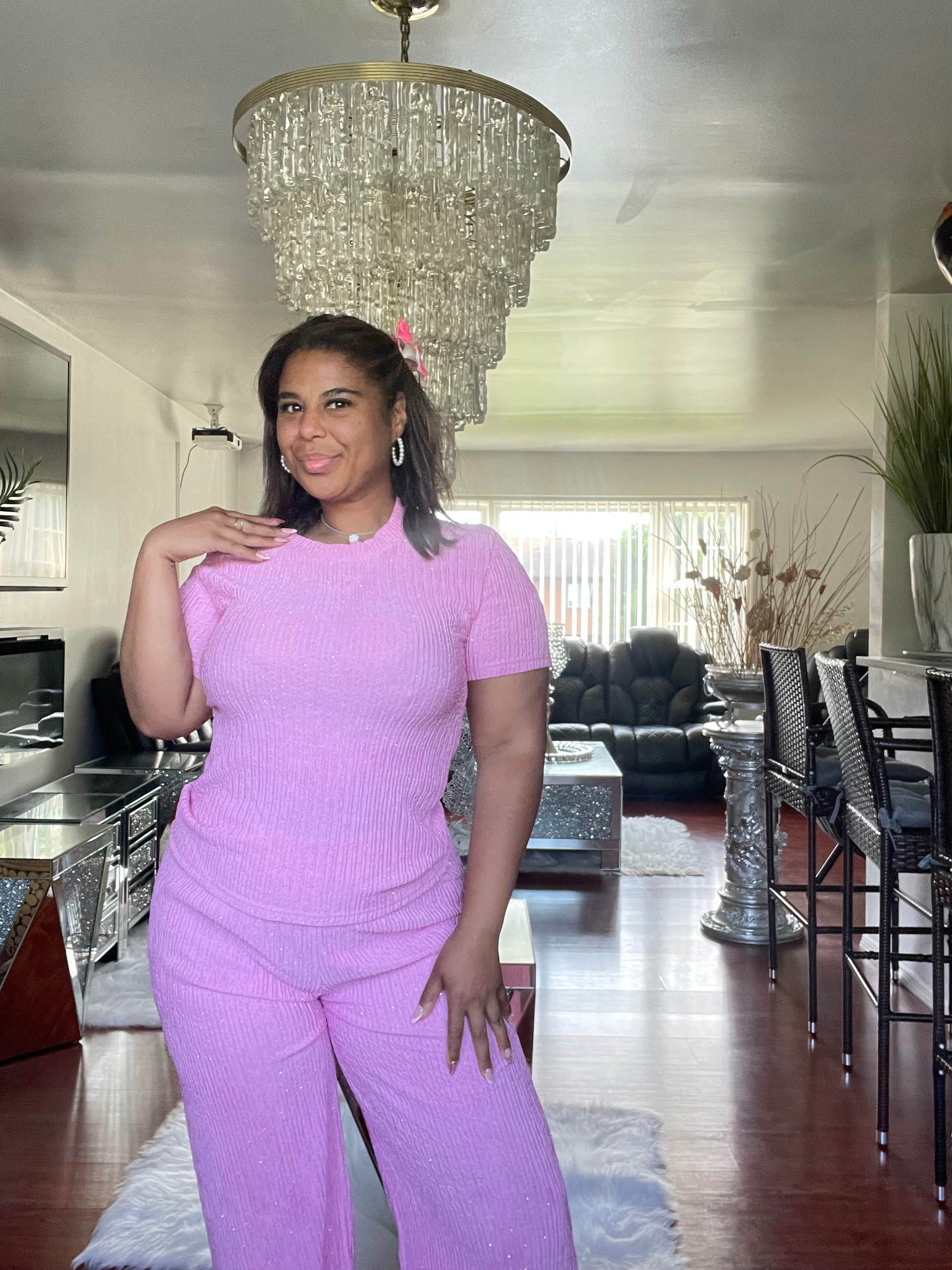 Turn heads effortlessly with this two-piece set that blends comfort and sparkle. This ribbed knit ensemble features a short-sleeve top and wide-leg pants in a soft bubblegum pink, all dusted with subtle glitter to give you that radiant glow with every move. The stretchy, breathable fabric hugs your curves in all the right places while keeping it relaxed and chic. Perfect for brunch, lounging in luxury, or shining bright at your next casual glam event.